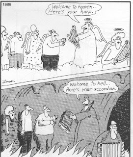 “Welcome to Heaven, here’s your harp. Welcome to Hell, here’s your accordion.”